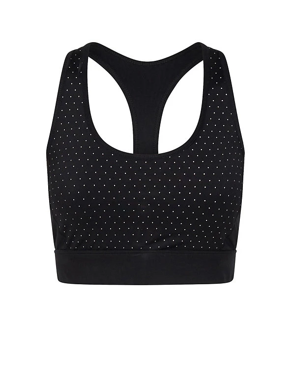 This polka dot sports bra from Dharma Bums will elevate your workout gear. The non-wired design has a wide underbust to minimise bounce and maximise comfort. Its higher neckline gives you full coverage when you move and bend during a workout. Removable cups add further support and fill out the bra for a better fit, while a racerback design prevents the straps from slipping.