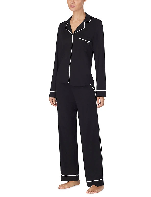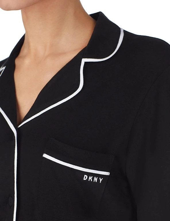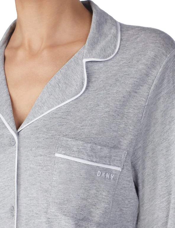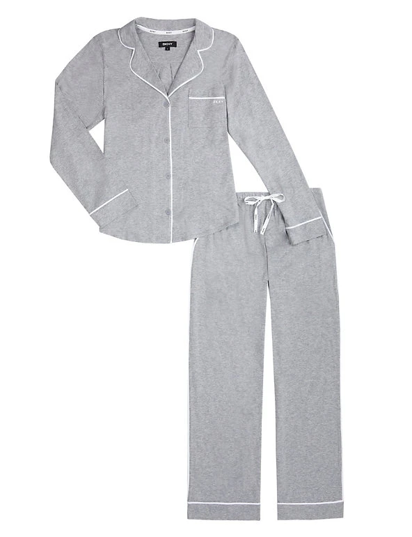Lounge in luxury with these cotton-rich pyjamas from DKNY. This regular-fit set includes a long sleeve pyjama shirt and trousers with a comfy elasticated waist. The top has button fastening and a branded patch pocket on the chest. These pyjamas are detailed with piping for a smart touch.