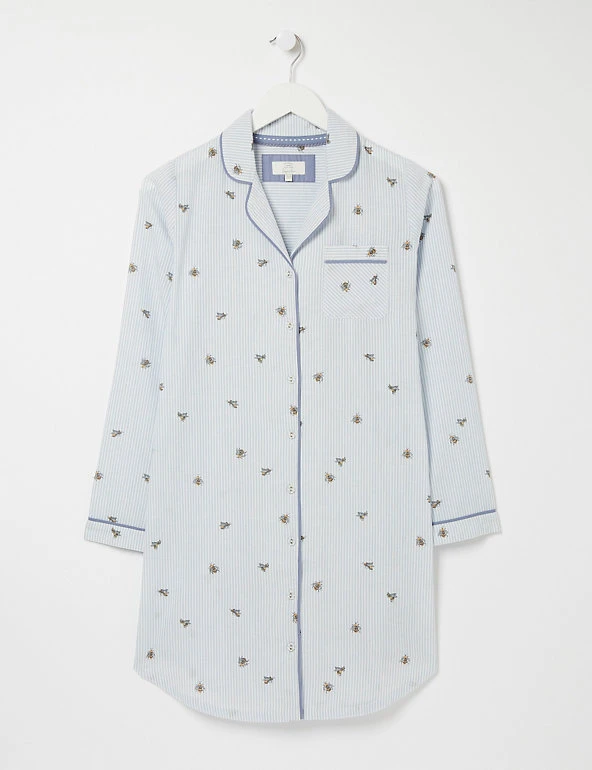 Treat yourself to extra-sweet dreams in this pure cotton nightshirt from FatFace. Its comfy regular fit and easy short length are complemented by a smart button-up style and a neat revere collar. The soft stripes are scattered with an all-over print of bees. A patch pocket on the chest, and contrasting piped trims, add crisp finishing detail.